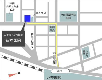 ![]() ![]() ![]() JR神田駅からすぐです。夜間診療も受け付けております。 〒101-0047千代田区内神田2-7-14山手ビル3号館4F *ビル入り口について* *夜間診療時間帯(21:30~22:30)について* googleマップで荻本医院を確認する ↓ JR神田駅の場合:西口(東京寄り改札を出て右側)から神田駅西口商店街に入る。 東京メトロ銀座線神田駅の場合:1番出口(JR側出口)からJR線沿い(左)に進み、 神田駅西口商店街(右)に入る。 神田駅西口商店街を進み、3つめの十字路左手昭和薬品本店を左折し、直進。 3つめの十字路右手第一電研ビル・フジカラー(カメラ店)隣。 |